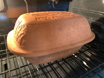 Enquanto preparo as batatas, deixo a Römertopf virada para baixo para escorrer o excesso de água.